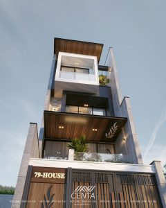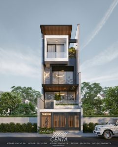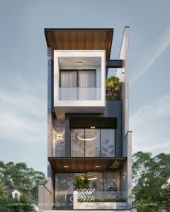 Tông xám – trắng hiện đại, xen lam gỗ sang trọng, tạo nên vẻ đẹp đơn giản nhưng bền vững. Một lựa chọn hoàn hảo cho những khu phố có mặt tiền hạn chế nhưng vẫn muốn thể hiện dấu ấn riêng.