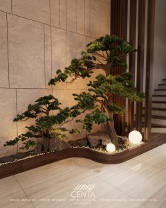 Ngay cạnh thang là một góc tiểu cảnh nhỏ nhưng được chăm chút rất tinh tế. Cây dáng bonsai, đá trang trí và ánh sáng hắt xuống nhẹ nhàng tạo nên một điểm dừng bình yên giữa nhịp sống bận rộn.
