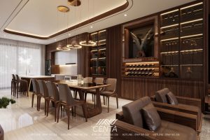 Bàn ăn gỗ nguyên khối là điểm nhấn vừa mạnh mẽ vừa ấm áp. Ngay cạnh đó, tủ trưng bày rượu được thiết kế rất duyên – ánh đèn LED âm nhẹ nhàng đủ để tạo nét sang trọng mà không gây rối mắt.